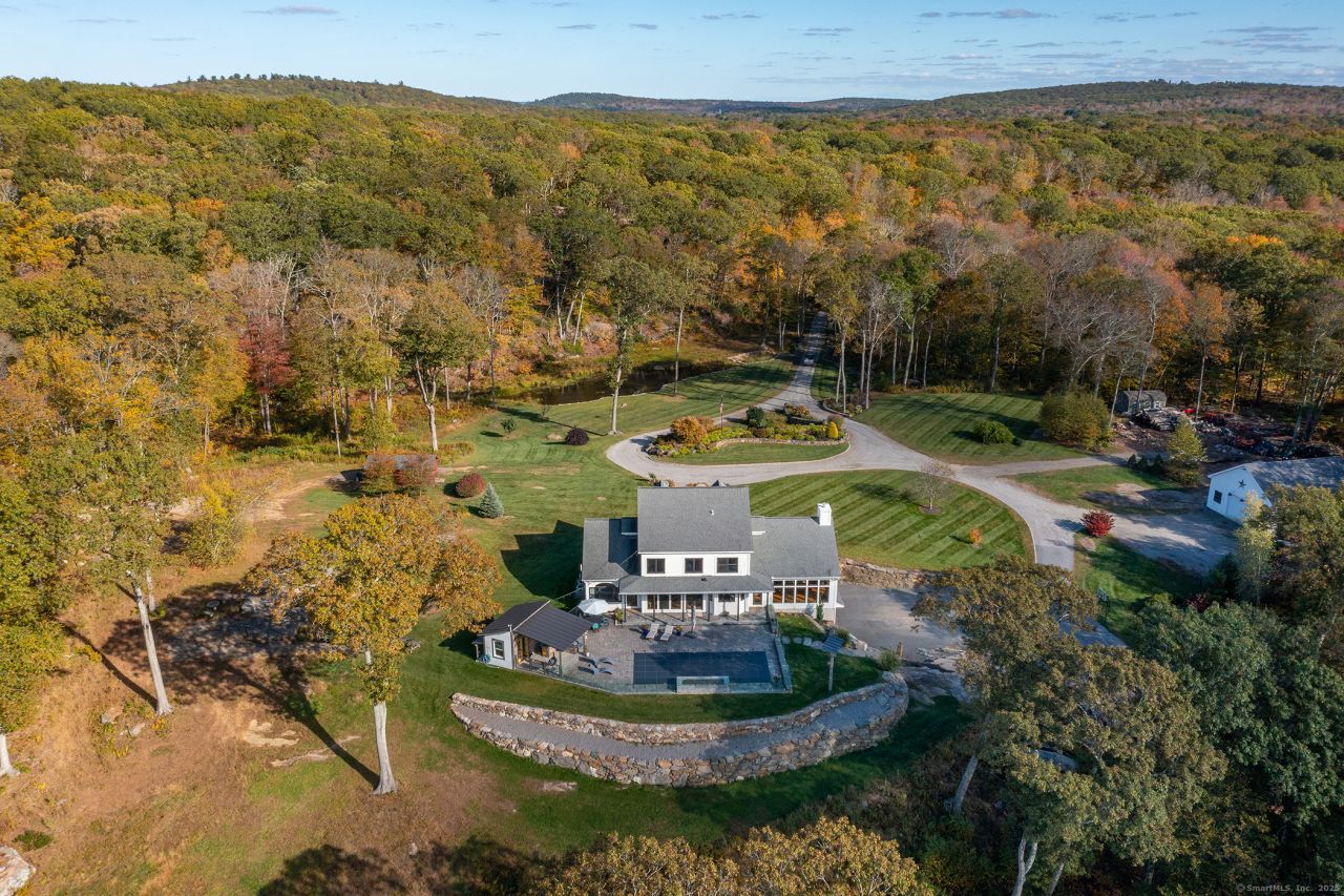 Perfectly positioned to capture breathtaking sunset views, this beautifully updated four-bedroom residence blends comfort, sophistication, and functionality. The home's chef-inspired kitchen features dual workstations and opens seamlessly to a cozy sitting area that extends outdoors to the pool and entertaining space. Here, you'll find a charming pool house, built-in grill, and bluestone patio-ideal for gatherings or quiet evenings under the stars. Inside, the great room impresses with walls of glass that flood the space with natural light and a fireplace that anchors the room with warmth and style. The main-floor primary suite offers a spa-like retreat with a soaking tub, separate shower, and dual walk-in closets. The main level also includes a formal dining room, a private office, and the convenience of a residential elevator providing easy access to all levels. Upstairs, there is an ensuite bedroom and two additional bedrooms that share a well-appointed bath. The finished lower level expands the living space with a full bath, laundry area, and flexible rooms perfect for a media room, gym, or recreation area. Set on a private 10+ acres featuring a picturesque pond and a detached barn ideal for a car enthusiast or hobbyist, this home offers the perfect balance of elegance, privacy, and modern living.